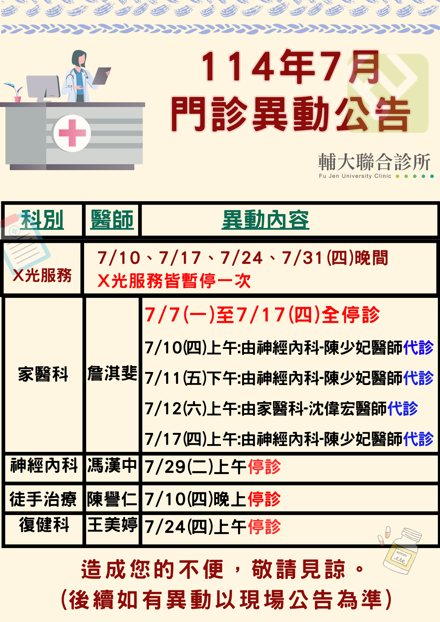 114年度7月份門診異動公告